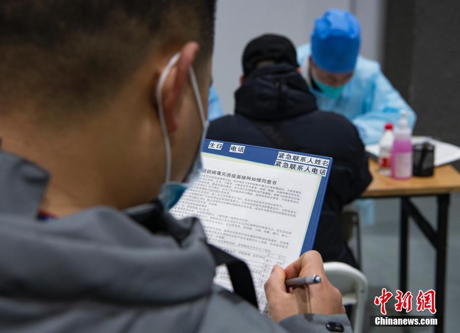 接種人員在設(shè)置于北京市朝陽(yáng)區(qū)朝陽(yáng)規(guī)劃藝術(shù)館的臨時(shí)接種點(diǎn)內(nèi)填寫(xiě)接種知情同意書(shū)。中新社記者 侯宇 攝