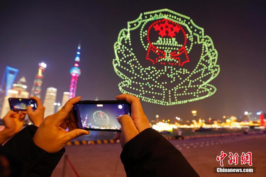 1月10日晚,1100架無人機從上海北外灘虹口濱江起飛,在空中組成多種圖案,向在首個中國人民警察節(jié)節(jié)日中堅守崗位的人民警察致以崇高敬意。中新社記者 殷立勤 攝