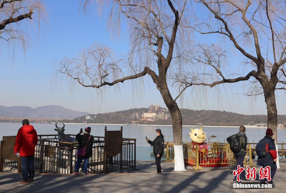 2月4日,游人在頤和園公園游覽,央視春晚牛年動(dòng)漫屬相吉祥物“小昂" 塑像在頤和園東堤銅牛旁邊陳列,古今兩個(gè)牛形造像共迎牛年的到來。 中新社記者 楊可佳 攝