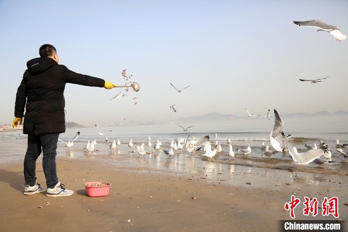 山東煙臺海濱“海鷗爭食”成風景(2)