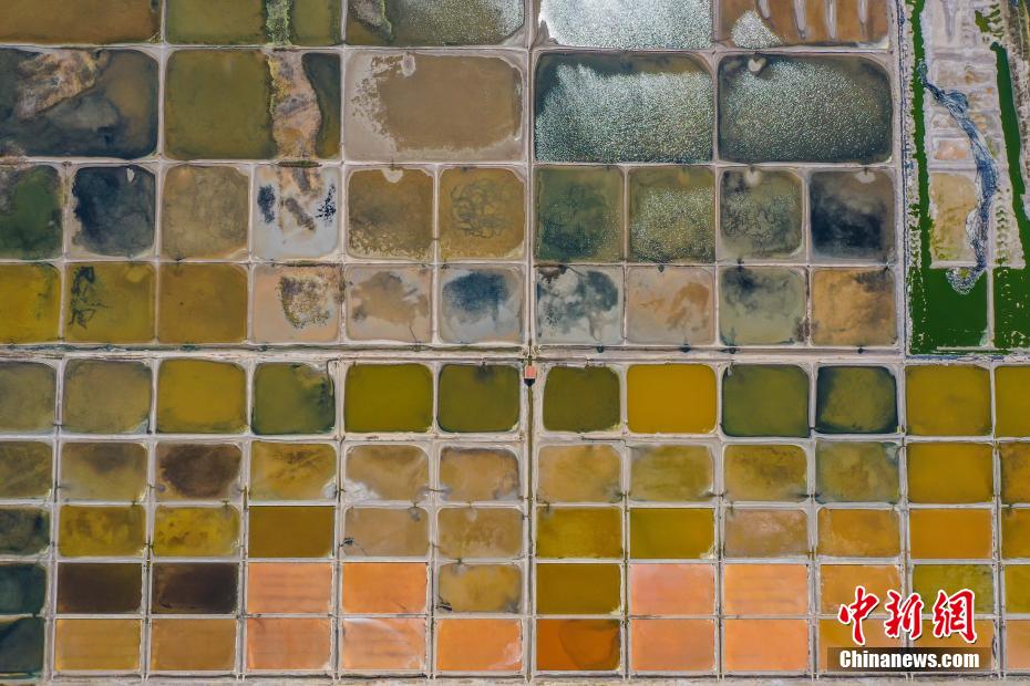 航拍山東榮成大海邊的多彩鹽田。 李信君 攝