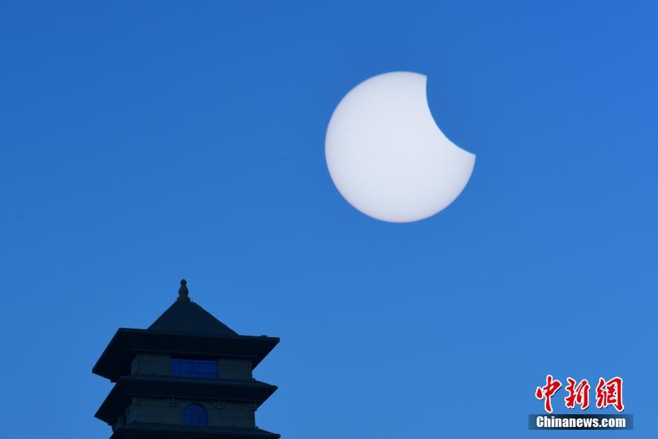 6月10日,新疆巴音郭楞蒙古自治州庫爾勒市的上空出現(xiàn)日偏食天象。中新社發(fā) 薛兵 攝