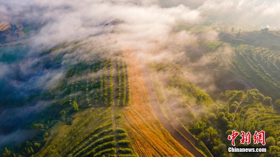 7月7日清晨,航拍寧夏固原市彭陽縣云海梯田。中新社發(fā) 王宇 攝