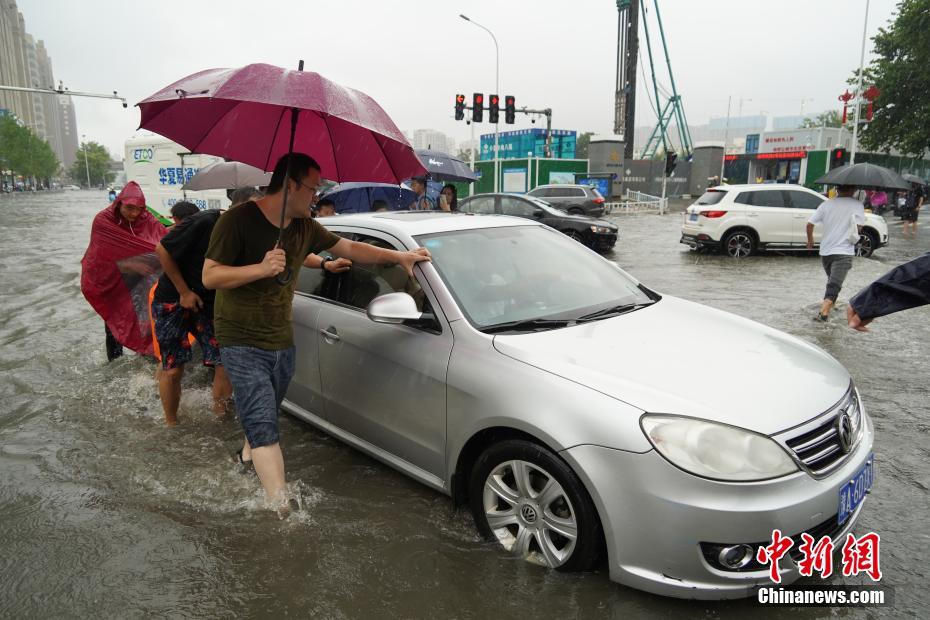 7月20日,河南鄭州,一車輛經(jīng)過(guò)積水路段后拋錨,眾人幫忙將其推出。近日,鄭州連遭暴雨襲擊,持續(xù)強(qiáng)降雨導(dǎo)致部分街道積水嚴(yán)重。 中新社記者 李超慶 攝