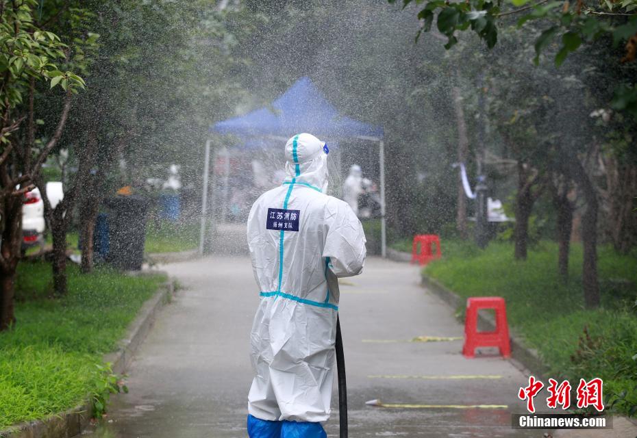 8月11日,在揚(yáng)州一處高風(fēng)險(xiǎn)地區(qū)的小區(qū),消防員在進(jìn)行消殺作業(yè)。 孟德龍 攝