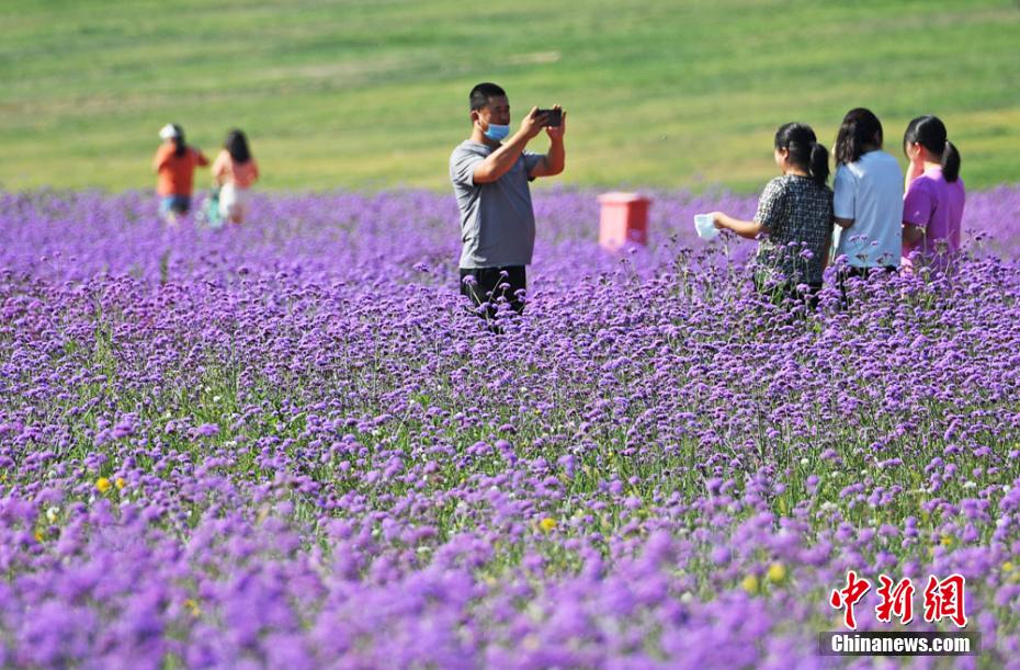圖為游客在花海中拍照留念。 楊艷敏 攝