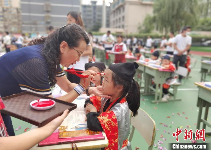 圖為老師為新生點(diǎn)朱砂“啟蒙”。 楊娜 攝