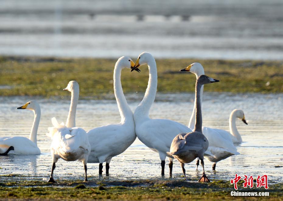2021年10月17日清晨,山東榮成天鵝湖畔的大天鵝。 中新社發(fā) 楊志禮 攝 圖片來源:CNSPHOTO
