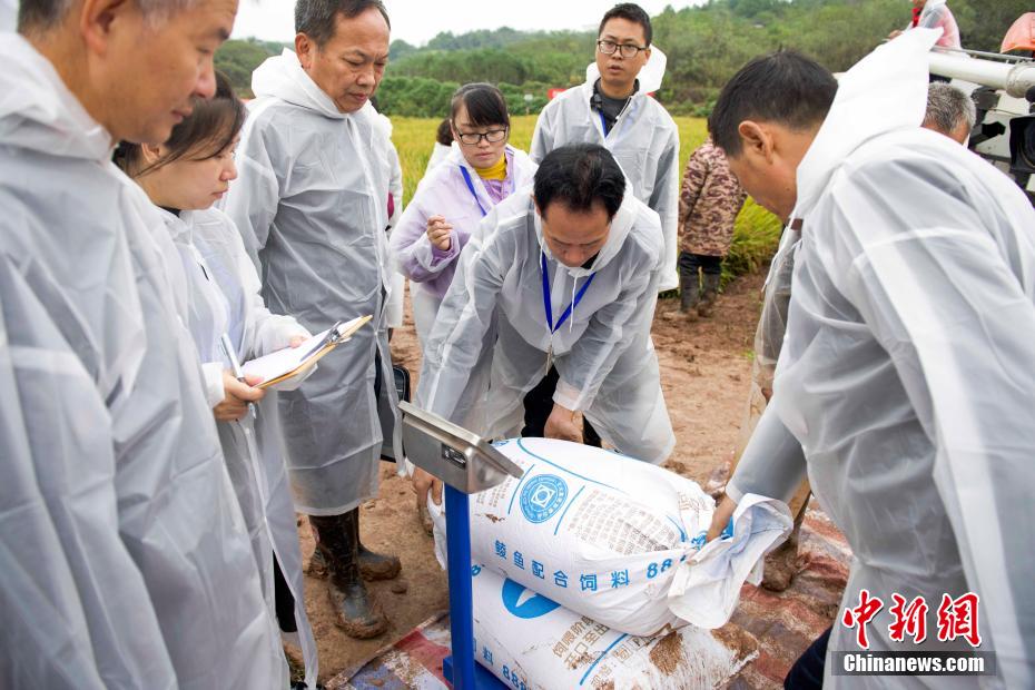 圖為工作人員對第三代雜交水稻進行稱重。 楊華峰 攝
