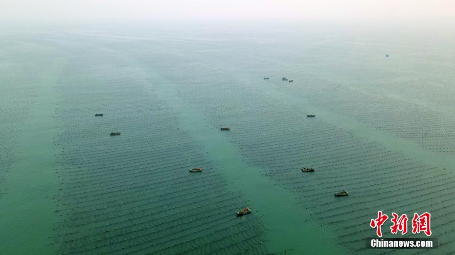 2021年12月6日,山東省榮成市石島管理區(qū)東楮島海洋牧場,最后一批海帶苗“插秧”完工,養(yǎng)殖工人在整理海帶架子。 中新社發(fā) 楊志禮 攝 圖片來源:CNSPHOTO