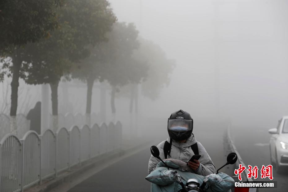 在華江公路上,市民在迷霧中騎行著。 殷立勤 攝