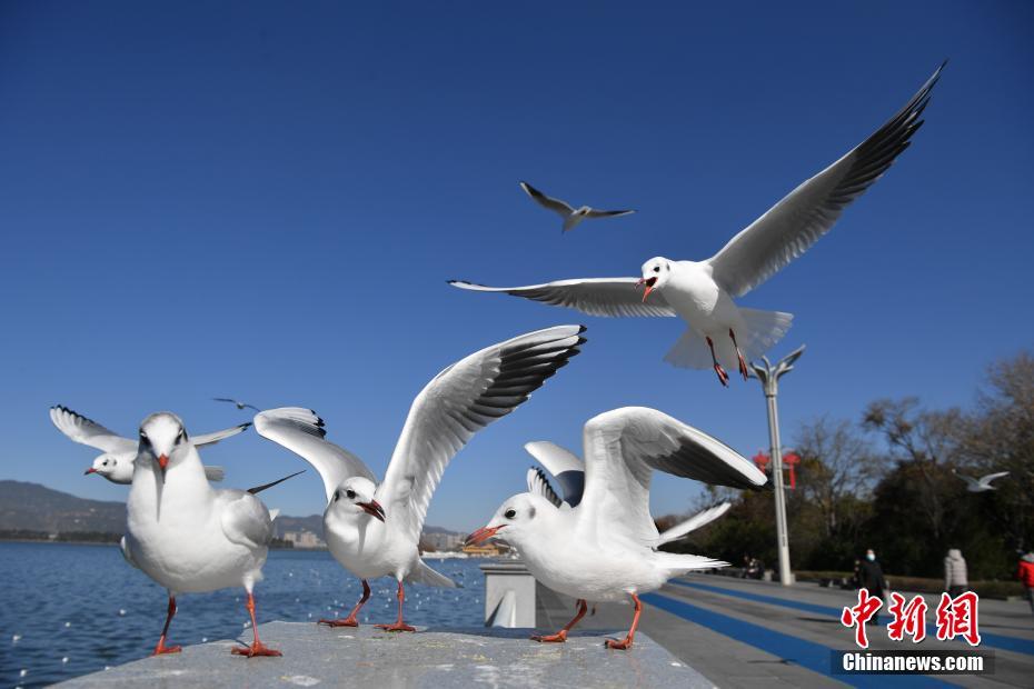 1月5日,滇池邊的紅嘴鷗。近期“春城”昆明氣溫宜人,進(jìn)入最佳觀鷗季。 中新社記者 劉冉陽 攝