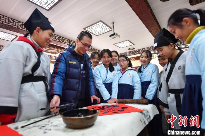書法老師為孩子們演示書寫虎年福字!⊥鹾I 攝
