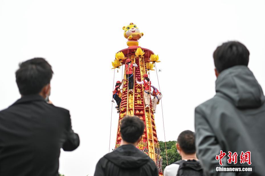 1月26日,廣東省廣州市,市民爬上“金山”摘水果。當(dāng)日,廣州蓮花山景區(qū)舉辦新春民俗文化活動(dòng),高16米的“金山”上堆砌著蘋(píng)果(代代平安)、柚子(越碌越有)、甘蔗(掂過(guò)碌蔗)等具有吉祥寓意的水果,吸引游客“爬金山”討好兆頭。中新社記者 陳驥旻 攝
