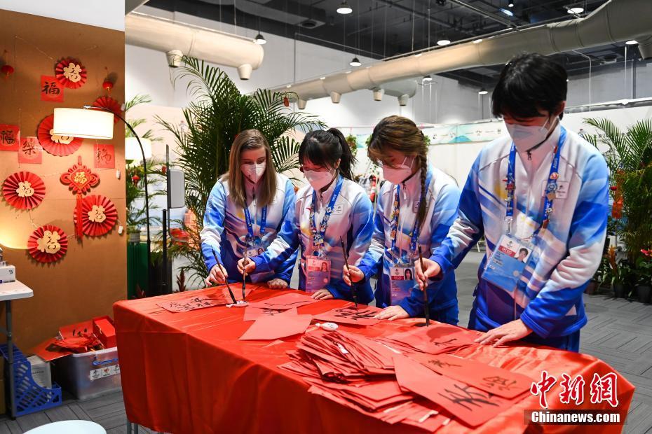 北京冬奧會將于2022年2月4日開幕,與中國農(nóng)歷虎年春節(jié)“完美邂逅”,純潔的冰雪將與熱烈的中國紅在這里“相遇”。日前,北京冬奧村、北京冬奧會主媒體中心以及北京冬奧服務保障酒店等地,在“!弊帧⒓t燈籠、春聯(lián)、剪紙、中國結等的點綴下,洋溢著濃濃的春節(jié)氛圍。圖為1月28日,主媒體中心內(nèi),志愿者們正在書寫新春祝福。 中新社記者 何蓬磊 攝