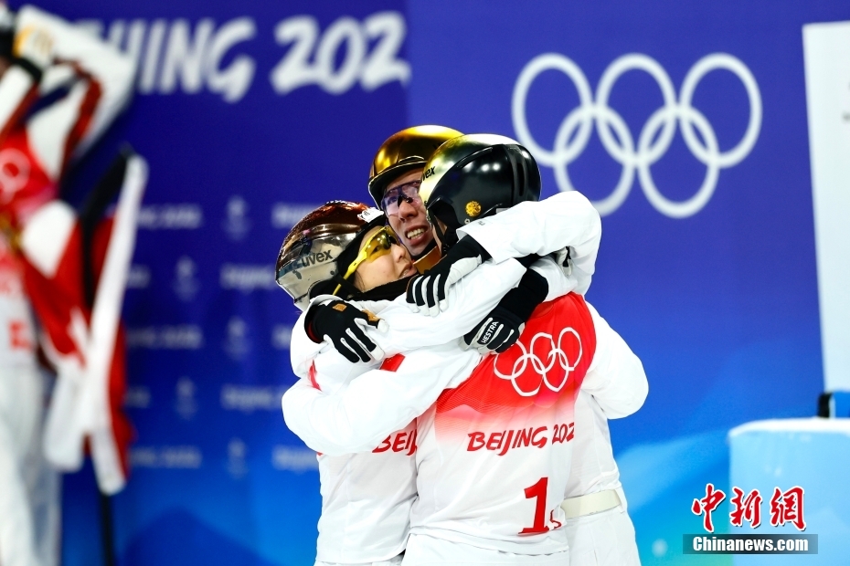 2月10日,北京2022年冬奧會自由式滑雪空中技巧混合團(tuán)體決賽在張家口賽區(qū)舉行。圖為中國隊(duì)選手徐夢桃(左)、賈宗洋(中)和齊廣璞在賽后擁抱。 中新社記者 富田 攝