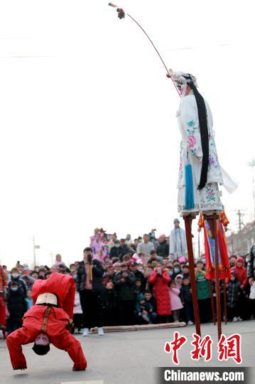 2月13日,元宵節(jié)前夕,民眾在山東濟(jì)南柿子園村觀看濟(jì)南西關(guān)高蹺隊(duì)的精彩表演,賞民俗歡度春節(jié)!×籂 攝