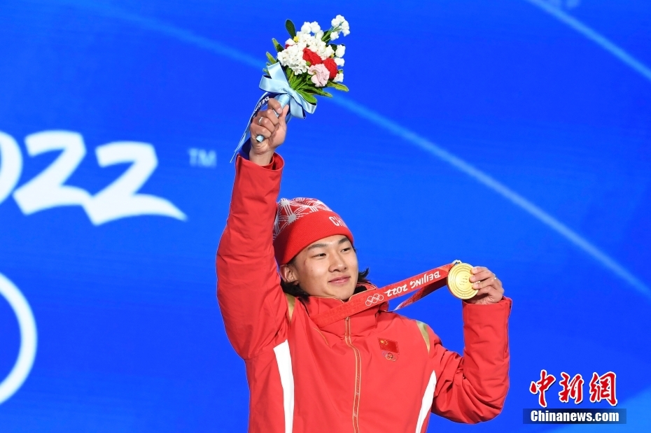 2月15日,在首鋼滑雪大跳臺舉行的北京2022年冬奧會單板滑雪男子大跳臺決賽中,中國選手蘇翊鳴獲得冠軍。圖為蘇翊鳴在頒獎儀式上。 中新社記者 李駿 攝