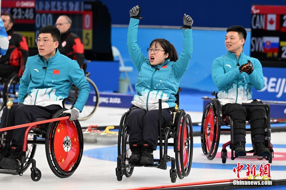 3月8日晚,北京2022年冬殘奧會(huì)輪椅冰壺循環(huán)賽第十一輪比賽在國家游泳中心舉行,中國隊(duì)以10比2戰(zhàn)勝美國隊(duì)。圖為中國隊(duì)歡呼。 中新社記者 劉冉陽 攝