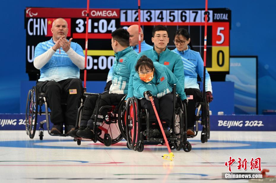 3月8日晚,北京2022年冬殘奧會輪椅冰壺循環(huán)賽第十一輪比賽在國家游泳中心舉行,中國隊(duì)以10比2戰(zhàn)勝美國隊(duì)。圖為中國隊(duì)閆卓擲壺。 中新社記者 劉冉陽 攝