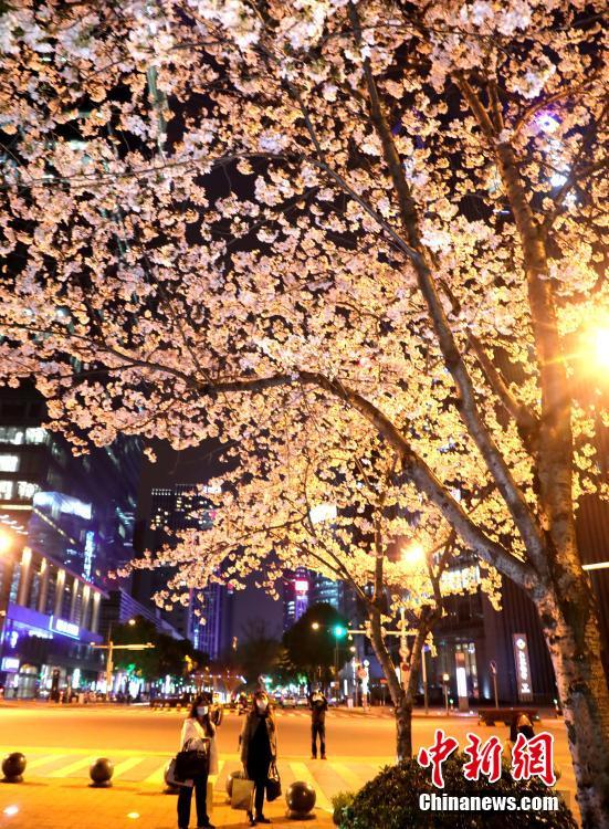 3月22日,江蘇蘇州,綻放的櫻花與當(dāng)?shù)貥?biāo)志性建筑——東方之門“同框”,吸引市民夜賞櫻花,拍照留影。中新社發(fā) 王建中 攝 圖片來源:CNSphoto