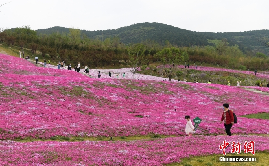 4月11日,山東濟(jì)南龍鼎大道南段,數(shù)萬株福祿考花競(jìng)相盛放,民眾徜徉在花海中,樂享春光。 中新社記者 張勇 攝