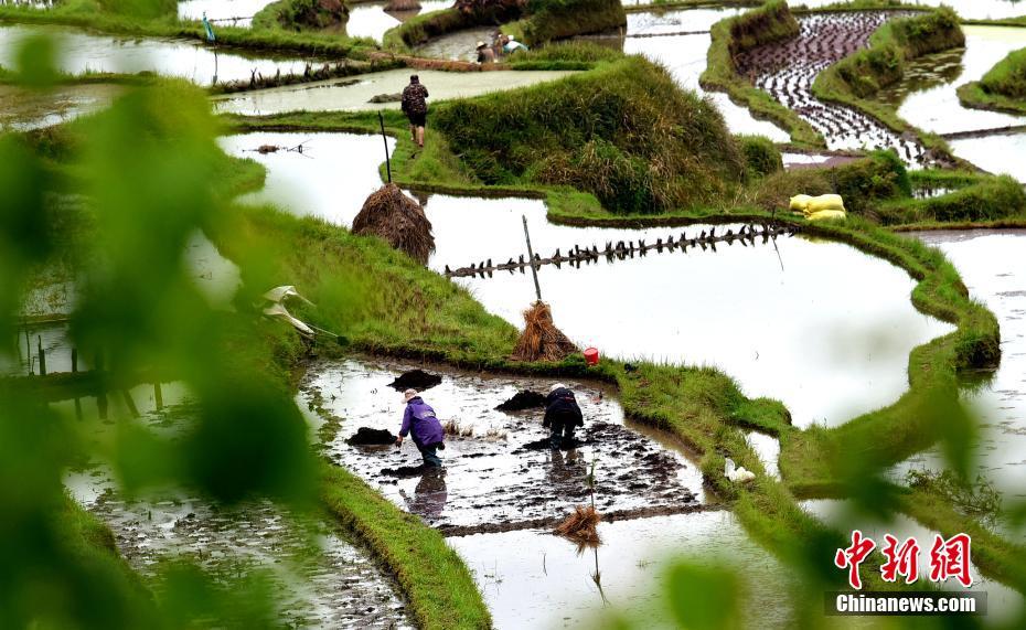 4月16日,村民在貴州省黔東南苗族侗族自治州從江縣翠里鄉(xiāng)岑豐村梯田移栽秧苗。 中新社發(fā) 龍夢(mèng)前 攝 圖片來(lái)源:CNSphoto