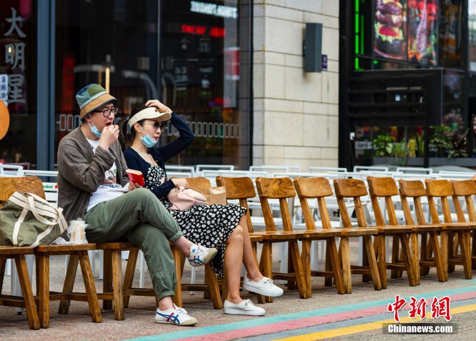5月1日,北京市華熙LIVE商圈內(nèi),兩位市民在一家餐飲店外品嘗外賣快餐食品。為降低疫情傳播風(fēng)險(xiǎn),“五一”假期(5月1日至4日),北京市餐飲經(jīng)營單位暫停堂食、轉(zhuǎn)為外賣服務(wù)。 中新社記者 侯宇 攝