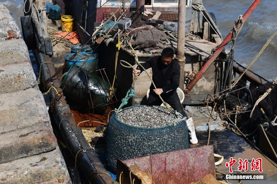 5月4日,山東青島,漁民從船上吊裝蛤蜊。隨著伏季“休漁期”開始,人工養(yǎng)殖貝類捕撈作業(yè)在養(yǎng)殖區(qū)內(nèi)加緊捕撈收獲,滿足市場鮮貨需求。中新社發(fā) 王海濱 攝