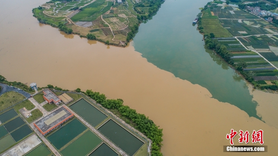 5月21日,廣西南寧江南區(qū)江西鎮(zhèn)同江村,地處左江、右江、邕江交匯處的三江口因左江上游連日強(qiáng)降雨,江水呈黃色,與右江綠色的江水交匯出現(xiàn)“涇渭分明”景觀。中新社發(fā) 彭寰 攝 圖片來(lái)源:CNSphoto