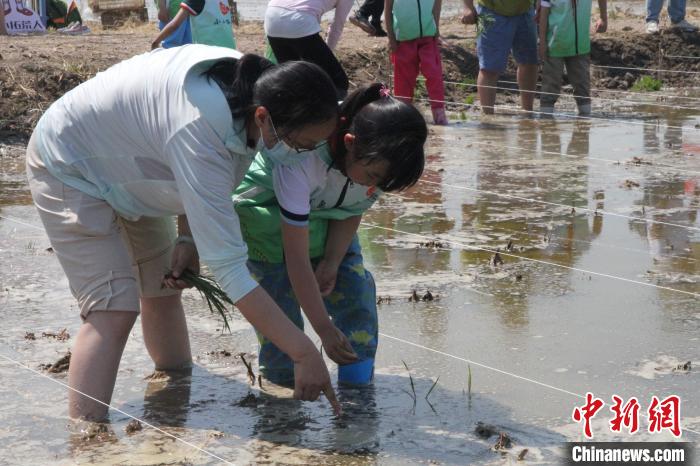 小朋友在家長的陪同下體驗插秧。 衣冠超 攝