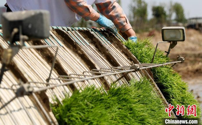 工作人員給自動駕駛插秧機(jī)填續(xù)秧苗!堖M(jìn)剛 攝