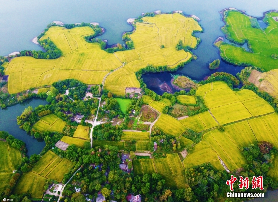 10月3日,金秋時(shí)節(jié),安徽省蕪湖市弋江區(qū)火龍街道新聯(lián)村數(shù)千畝水稻陸續(xù)成熟,田間地頭一片金黃,豐收在望。從空中俯瞰,湖泊、道路、村莊和金黃的稻田繪制成一幅美麗的江南水鄉(xiāng)金色田園畫卷。 圖片來源:ICphoto