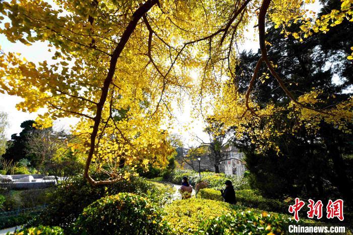 游客在銀杏樹下賞景游玩!⊥鹾I 攝