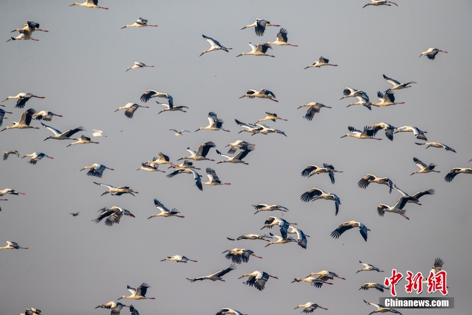 近日,數(shù)百只東方白鸛飛臨臨沂市郯城縣沂河畔越冬,給平靜的河灘增添了一道美麗的風景。圖為12月19日,山東省臨沂市郯城縣,一群東方白鸛在沂河馬頭段飛舞、休憩。 中新社發(fā) 房德華 攝 圖片來源:CNSphoto
