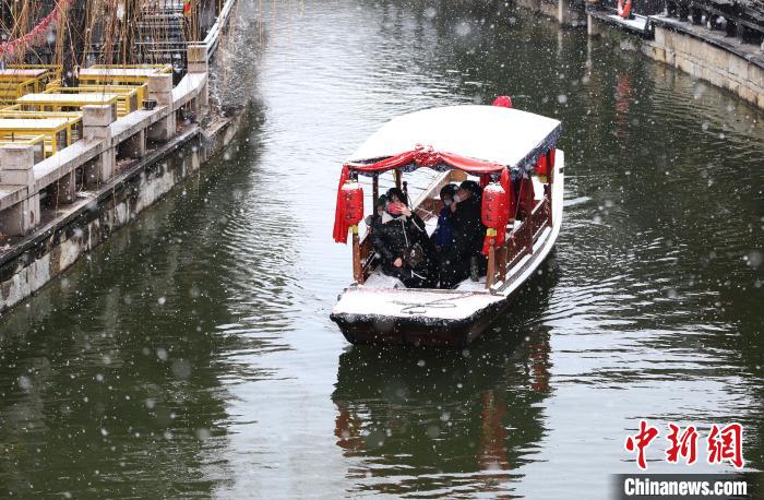 在山東省棗莊市臺兒莊古城,游客乘船觀賞雪景!垏佬 攝
