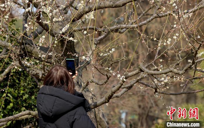 圖為一位游客拍攝綻放的梅花 張暢 攝