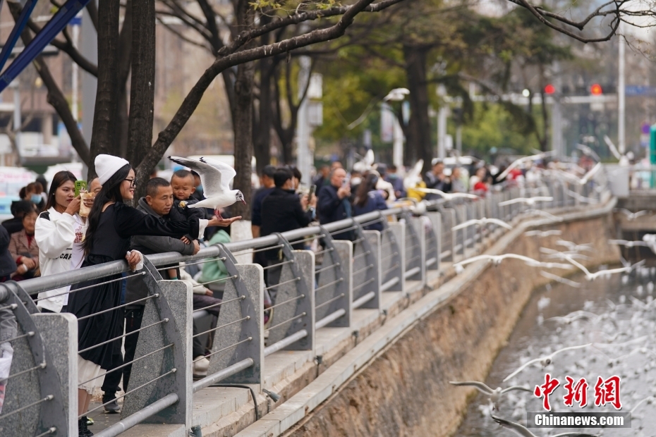 3月5日,大觀河上翱翔的紅嘴鷗。進入3月份,云南昆明天氣逐漸變暖,越冬的紅嘴鷗即將飛離當?shù)。不少市民周末來到大觀河邊觀鷗喂鷗,送別“春城”的老朋友,期待和它們冬天再相聚。中新社記者 劉冉陽 攝