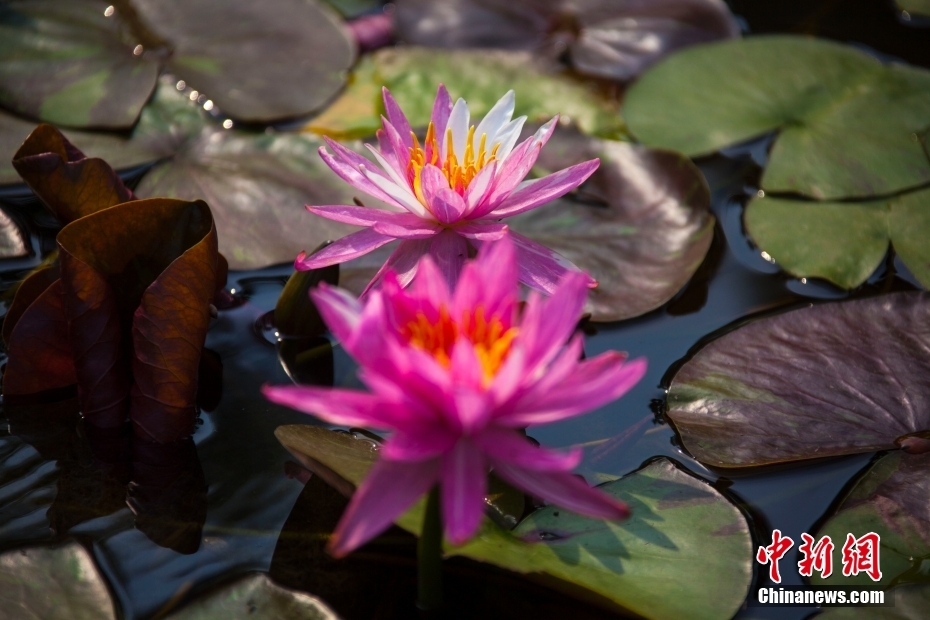 6月15日,在南京玄武湖公園拍攝的雙色睡蓮(上)。這株由紫紅色和純白色組成的“雙色睡蓮”色彩獨特,吸引不少游客駐足觀賞。圖/CNSphoto 孫忠南 攝