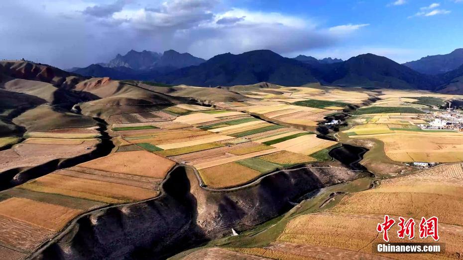 秋日,在位于祁連山腹地的青海省海北藏族自治州祁連縣境內(nèi),田野里的青稞、小麥顆粒飽滿。從空中俯瞰,金色的田野、綠色的草原、連綿的山巒交相輝映,宛若一幅“大地油畫”,游客在田間或是漫步,或是起舞。海北州祁連縣地處祁連山中段腹地,農(nóng)作物以青稞和油菜籽為主,到九月底這里將迎來牛羊出欄、農(nóng)作物收割的豐收季。圖為祁連山腹地田野色彩斑斕。 楊春麗 攝