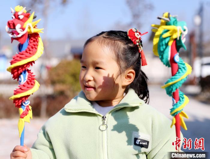一位小朋友手持“祥龍”面塑作品玩耍。張進(jìn)剛 攝