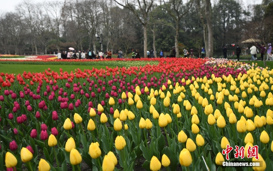 3月18日,大片的郁金香吸引游人。江南春日,浙江杭州西湖太子灣約40萬株郁金香次第開放,爛漫景象令人流連。中新社記者 王剛 攝