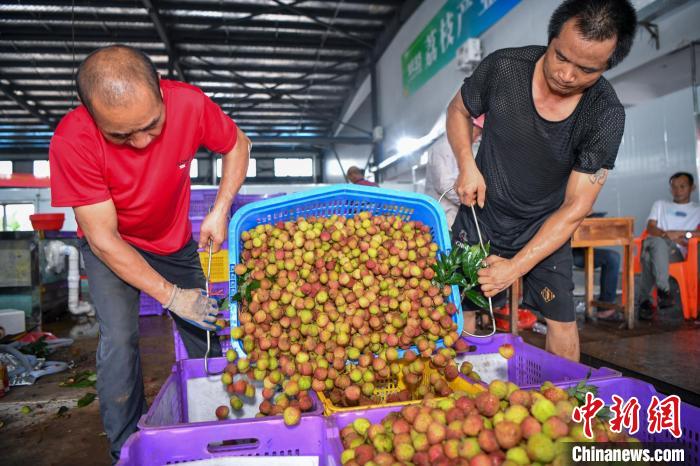 圖為海南紅明農(nóng)產(chǎn)品(荔枝)交易中心的工作人員搬運(yùn)荔枝。中新網(wǎng)記者 駱云飛 攝