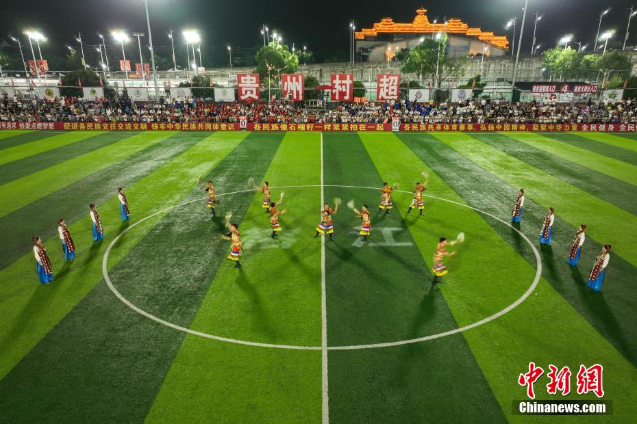 6月10日,河南省洛陽市、西藏自治區(qū)日喀則市、內(nèi)蒙古自治區(qū)呼倫貝爾市的足球隊齊聚貴州省黔東南苗族侗族自治州榕江縣“村超”足球場。除了開展足球友誼賽外,三個城市的拉拉隊和助演嘉賓還分別在球賽中場休息和展演環(huán)節(jié),為上萬觀眾帶來了極具特色的節(jié)目表演。圖為航拍日喀則市的舞蹈《卡爾薩》。(無人機(jī)照片)瞿宏倫 攝