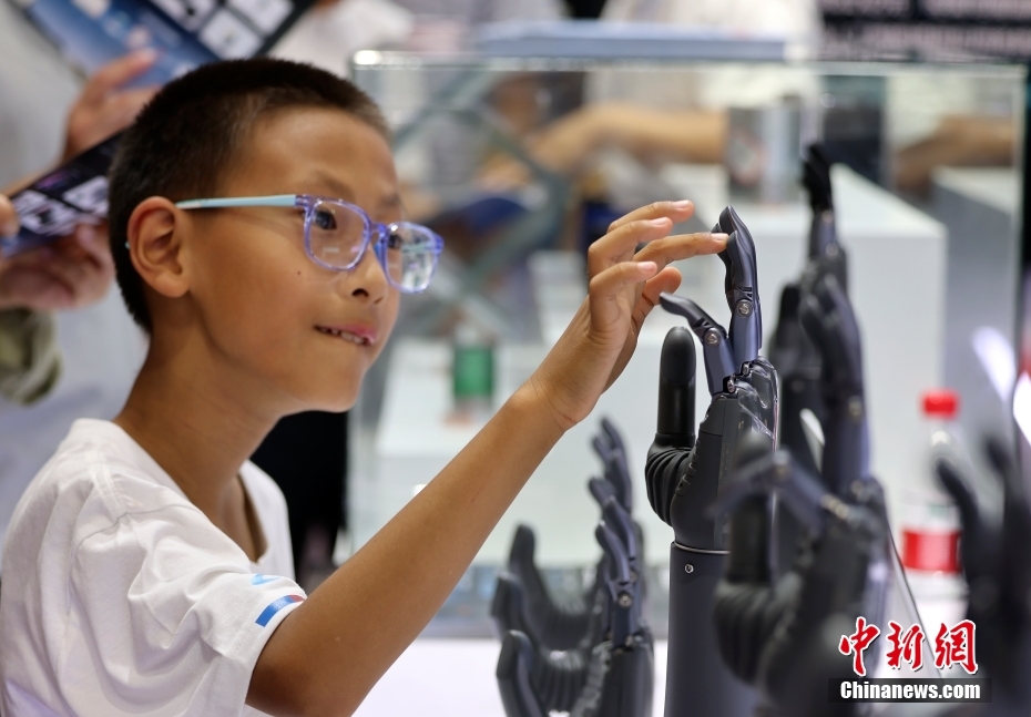 小朋友觀看仿生手。中新社記者 張宇 攝