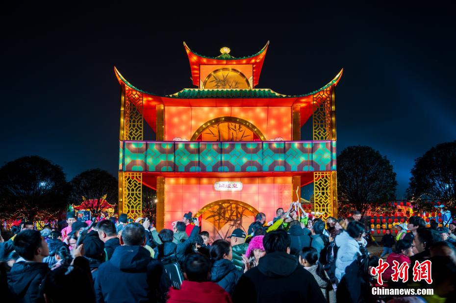 1月22日晚,2025貴陽觀山湖燈會廟市在貴州省貴陽市觀山湖公園亮燈,吸引眾多市民前來觀賞。圖為貴陽觀山湖燈會廟市現(xiàn)場,市民參與燈會互動活動。中新社記者 唐哲 攝