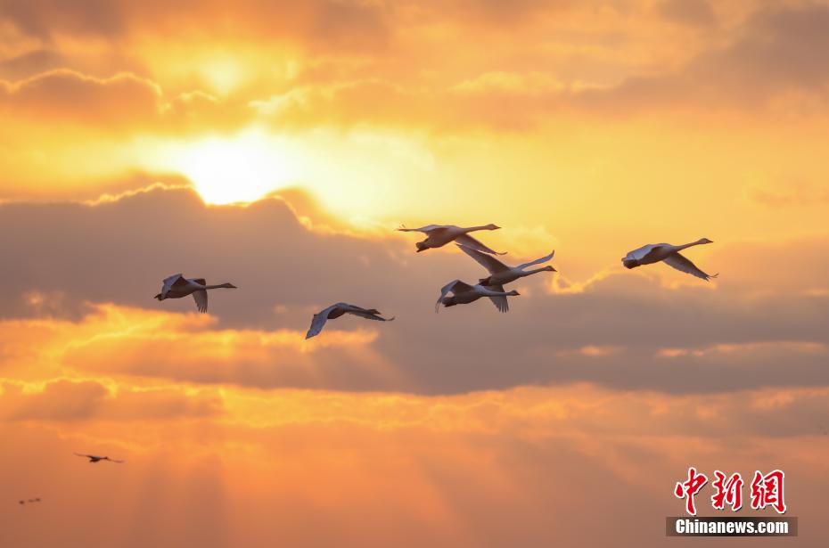 2月23日,在山東榮成大天鵝國(guó)家級(jí)自然保護(hù)區(qū)天鵝湖,成群的大天鵝在練習(xí)飛行,為長(zhǎng)途遷徙“熱身”。近期,天鵝湖上空頻繁出現(xiàn)大天鵝編隊(duì)飛行的壯觀景象。每年10月中下旬,上萬(wàn)只來(lái)自西伯利亞等地的大天鵝飛臨“中國(guó)大天鵝之鄉(xiāng)”山東榮成越冬,翌年3月回遷。李信君 攝