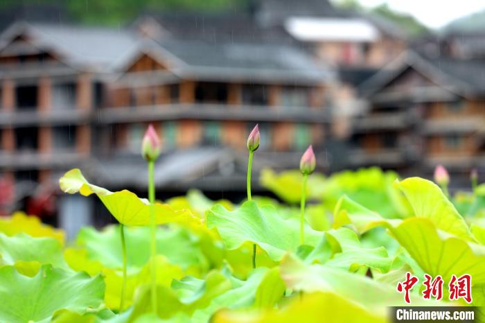 近日,廣西三江侗族自治縣林溪鎮(zhèn)程陽八寨合龍橋畔荷花初綻,碧綠荷葉隨風(fēng)搖曳,與侗寨的風(fēng)雨橋、鼓樓、吊腳木樓等特色建筑相映成趣,織就一幅詩意畫卷,吸引游客前往賞花拍照。圖為當(dāng)?shù)睾苫谰啊}徠湛?攝