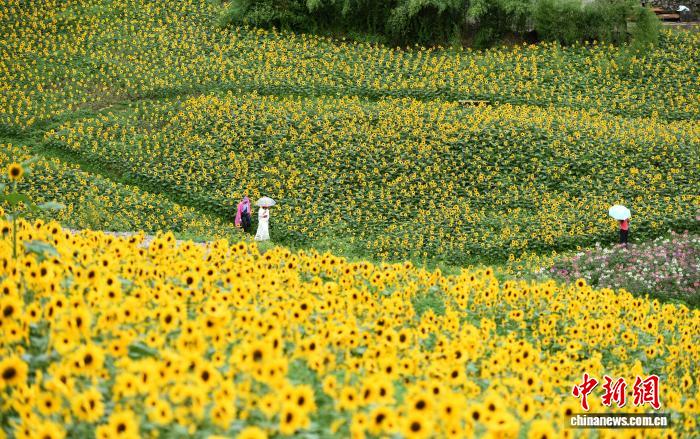 時下,貴州省六盤水市明湖花谷100多畝向日葵、醉蝶花競相綻放,宛如一片絢麗的“花!,吸引眾多外地前來避暑的游客游玩“打卡”。圖為7月24日游客在明湖花谷賞花游玩。黃慶松 攝