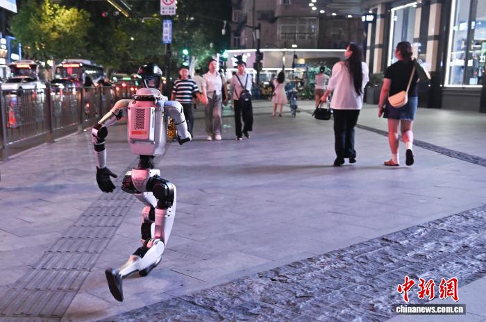 8月19日,人形機器人在街頭“奔跑”。當日,浙江杭州西湖附近街頭,一臺人形機器人在工作人員監(jiān)控下進行“逛街”展示,吸引民眾關注。據(jù)介紹,該機器人搭載智能化模塊后具備自主導航、避障等功能。中新社記者 王剛 攝